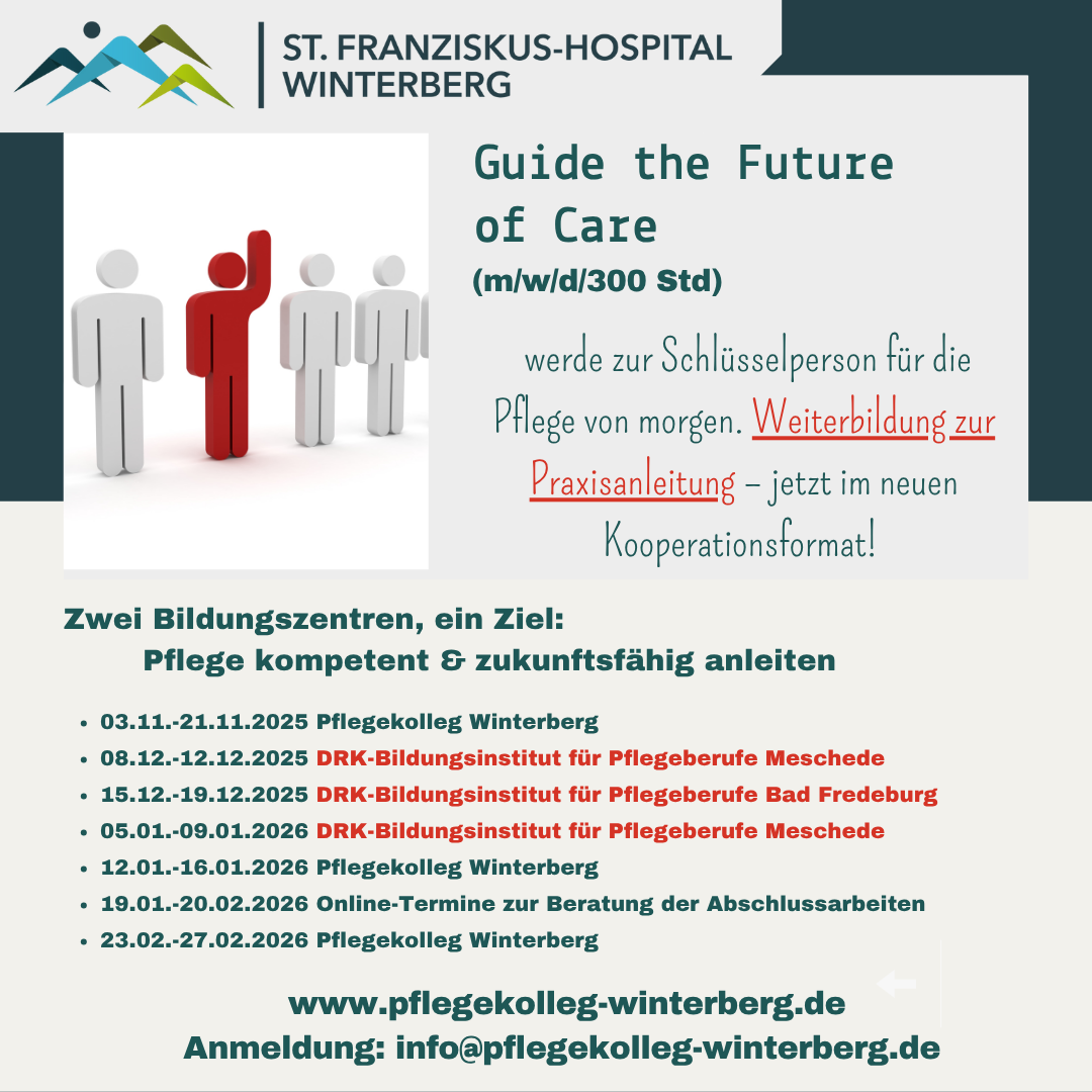 Wir möchten mit dem Pflegekolleg am St. Franziskus-Hospital in Winterberg jetzt unser Engagement in der Region ausweiten und jungen Menschen rund um Winterberg, Medebach, Hallenberg usw. eine hochwertige Ausbildung in einem Berufsbild der Zukunft im Idealfall wohnortnah anbieten. Die wachsende Bedeutung des Pflegeberufs in Zeiten des Fachkräftemangels und des fortschreitenden demographischen Wandels ist unbestritten.